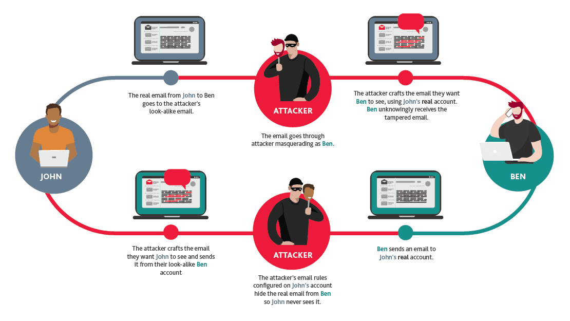 - This process allows the attacker to conduct business with you as usual (masquerading as your business partner or client), and this is when the malicious intent manifests itself. The attacker can search for, and access, financial and other sensitive information and hide messages and responses they don’t want the user to see.