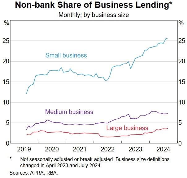 The Reserve Bank says the non-bank lenders are writing the bulk of their business in financing assets such as plant and equipment, rather than property, where the bigger banks have focused. Other options for SMEs include fintechs, private credit providers and revenue-based financial models.